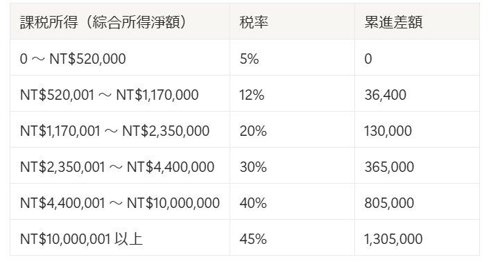 なお、2025年の改正においては、課税区間が引き上げられ、5% 区間の上限が NT$590,000 となる等の調整がなされているとの報道もある。(AlphaLoan 阿發龍)